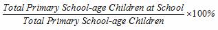 refers to the proportion of children enrolled at primary schools to the total number of primary school-age children (including retarded children, but excluding blind, deaf and mute children). The formula is: